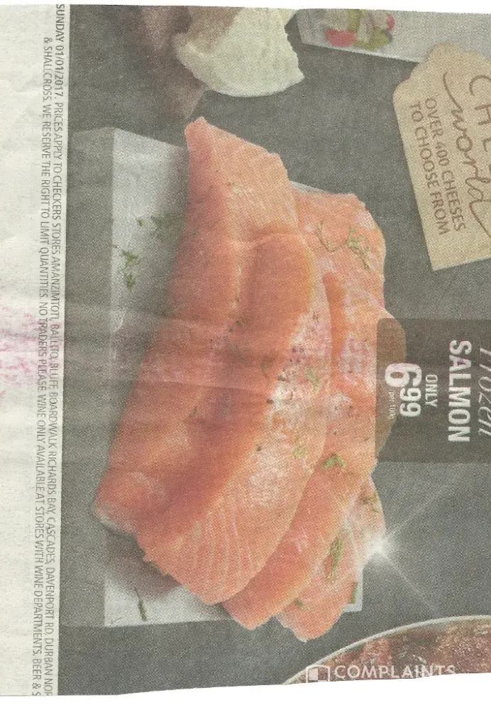 In the Natal Mercury of 28th December 2016 there was a double page ad for various items at Checkers and Checkers Hypers. The item that caught my eye was frozen salmon at R6.99 per 100g and a picture of pink salmon filleted and deboned advertised the product. On 29th December 2016 I went to the Checkers Cascades branch and after some time was assisted by the "fish" person who told me that it was a mistake in the paper and only available at the Checkers Hypers, altho the ad specifically stated that the specials were available at both. I was told to go to the Brookside Checkers Hyper which I did - only to be eventually by a manager that neither the branch manager, nor anyone else, knew anything about the advert or the salmon. The assistant at the fish counter told me that it was Cape Salmon and produced an entire fish with head and tail, nothing like the misleading picture that was put in the paper. I travelled about 30 kms in all and wasted at least an hour and a half and I'm afraid I left empty handed and vowing never to shop at Checkers again. This is a case of blatant misleading advertising and Checkers should be ashamed of themselves!