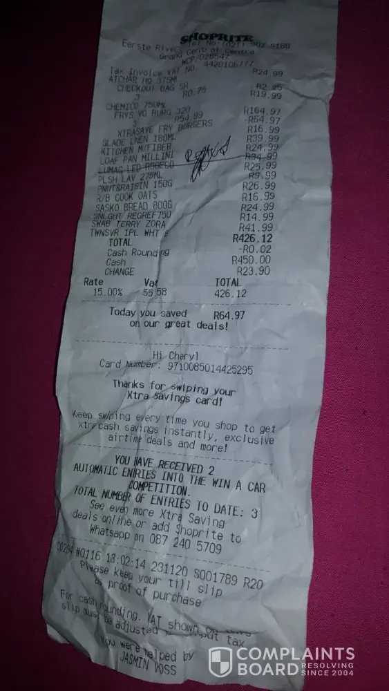 On 23/11/2020 ar 13:02, I paid for 3 boxes of Fry's Veg Burgers, R100 with the xtra savings card at Shoprite, Eerste River Mall, CT.