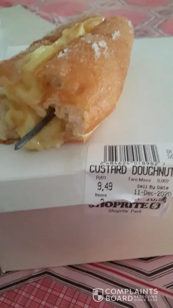 I just bought some things at Shoprite in China town Parow store and just got home to enjoy the donuts I bought from the store, only to find that there was a piece of iron or what looks like a nail inside one of the custard donuts.