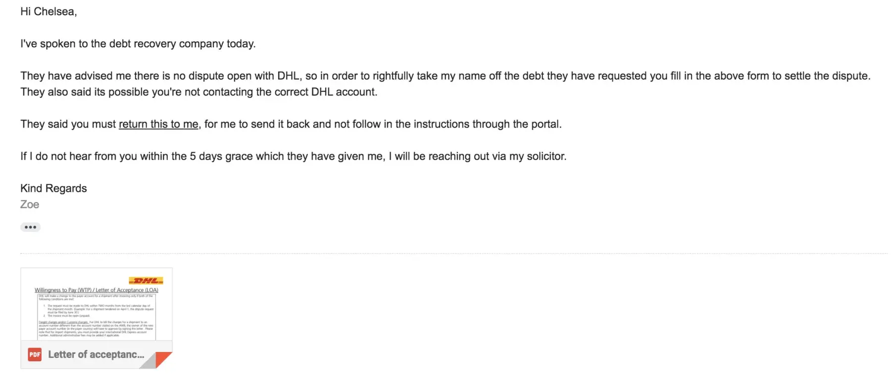 Desired outcome: For showpo to pay the fee to DHL that is owed so that my name is not on a debt
