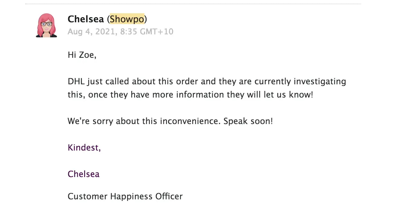 I genuinely was so excited to receive my order. I ordered multiple dresses to take with me on a destination wedding. I ordered the pieces 3 weeks before the wedding hoping they would make it to me within the 7-10 business days, I had no idea it was even coming from Australia and had I knew I would have upgraded my shipping to arrive faster but after reading reviews, that wouldn't have even mattered. My tracking hasn't moved from Australia and I only got another shipping link to DHL by chatting them and them telling me in 48 hours it will update and be transferred to USPS. It never transferred and I've been on the phone with DHL and chatting them who told me the package has come through customs and was released but is unable to be located. They also told me if it was found, it would take another 8 days to even arrive to me?Told this to Showpo and my responses from them have been full of attitude and bad customer service. They have been so unhelpful and told me i had to wait 1 business day to put in a request to them to track down the order (this chat was at 9pm at night here and I stated that the next business day was in a few hours and all i got was attitude from the customer service agent.) once i waited, they still have yet to give me an update, and said that update would come in a few days, 2 days before I'm supposed to leave for this wedding because of when i put in the request?. I put in the request when I was told to put in the request. I've never been one to complain but the fact that I let them know my order was stuck in processing and lost, they couldn't help me because they were in Australia. If this is their excuse then maybe don't advertise that you ship to the US and that you won't be helpful when the package is lost?. Seems like this is pretty normal for them per reading reviews. I'm genuinely so disappointed in this brand and will now be out of multiple dresses for this wedding that i spent a few $100 dollars on.