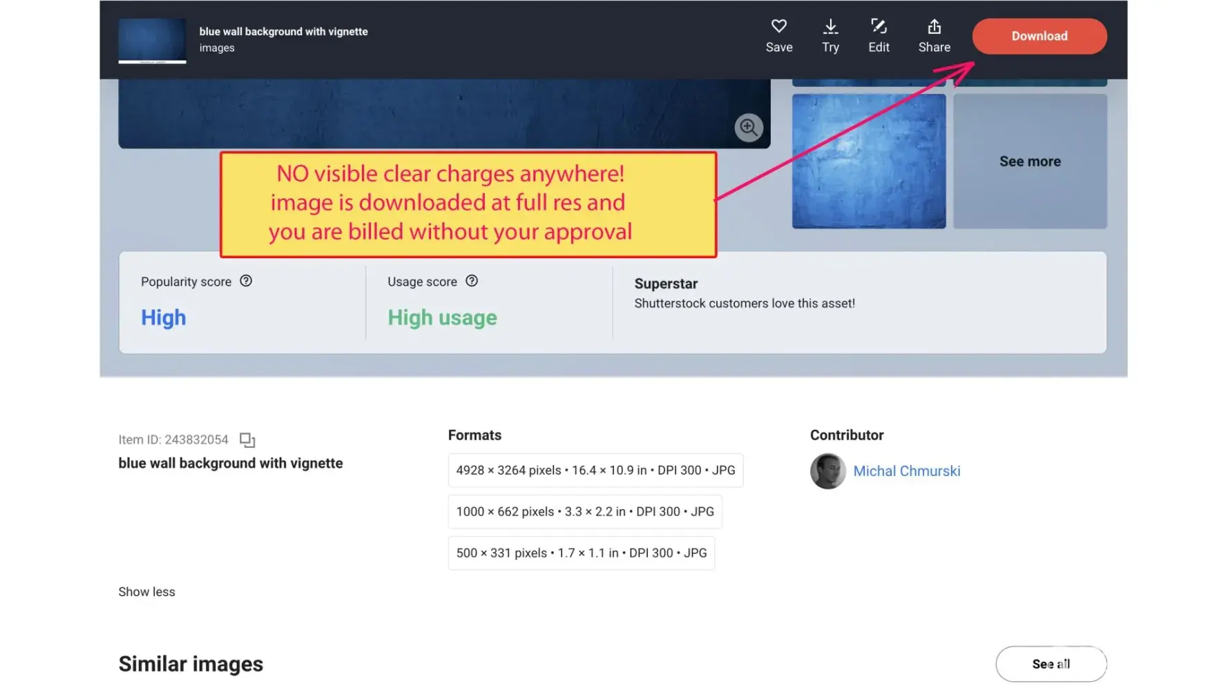 I bought one image from Shutterstock in Dec 2021 and knew and approved the charge. In Feb 22 I browsed images and downloaded 6 textures that I thought were small and would have the shutterstock watermark which was what I needed (free). I was notified by Paypal that I was billed three times 29$ for three 365day plans without my approval or my knowledge! I have no idea what this plan is. I called to resolve this and the customer service man was extremely unhelpful and could not do anything to reverse the charges. When I purchased the 1 image back in DEC I was not asked to join any plan, yearly or on demand. I paid 21$ and that was it. apparently what I I purchased was an "on Demand" plan for two images and they automatically put me on this plan for future downloads without my approval. I did not know it. I am very careful to understand charges. the Shutterstock man said I purchased on demand. I did not do such thing and and can prove with screen shots that the page does not alert you, you are about to make any purchase or join any plan. I would not willingly purchase 3 expensive monthly plans in less than one hour at 29$ for only two images each. After this encounter I searched for reviews and found to my horror that was not the only one scammed.