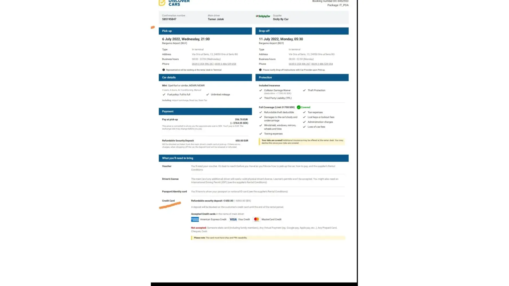 I've rented a car from 6th until 11th of July (Bergamo) 2022 booking no:DC-3452553