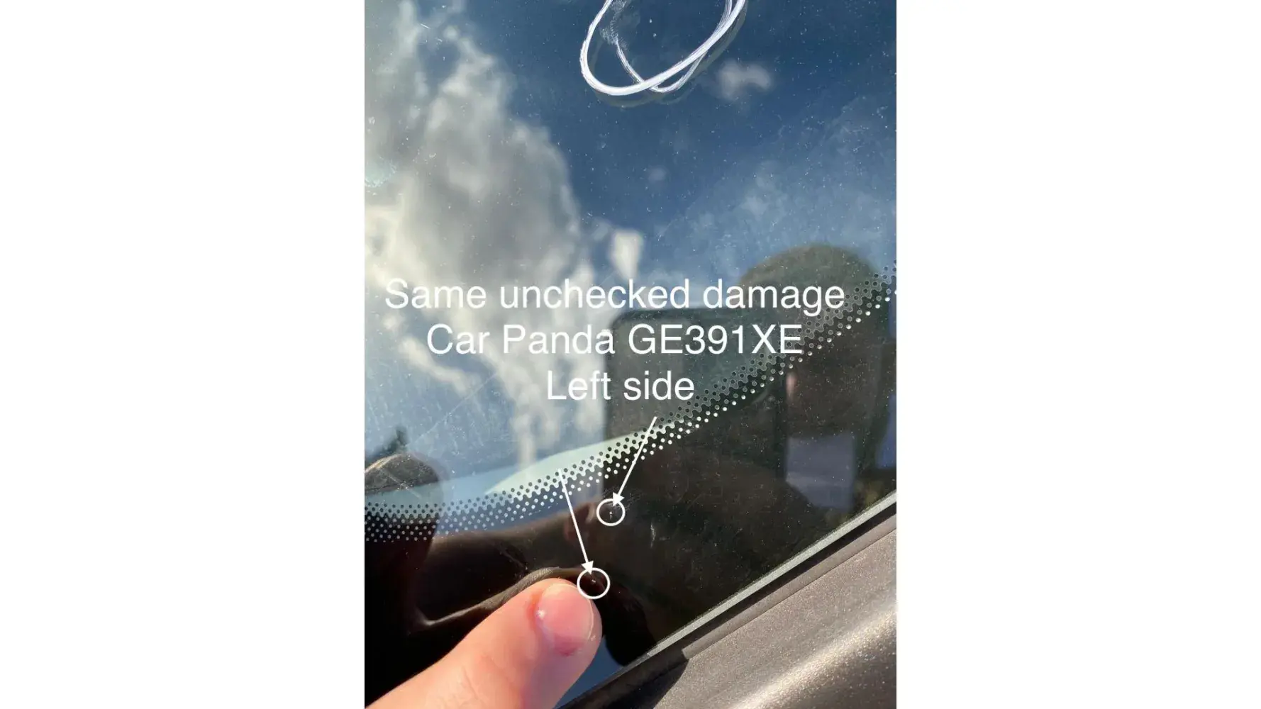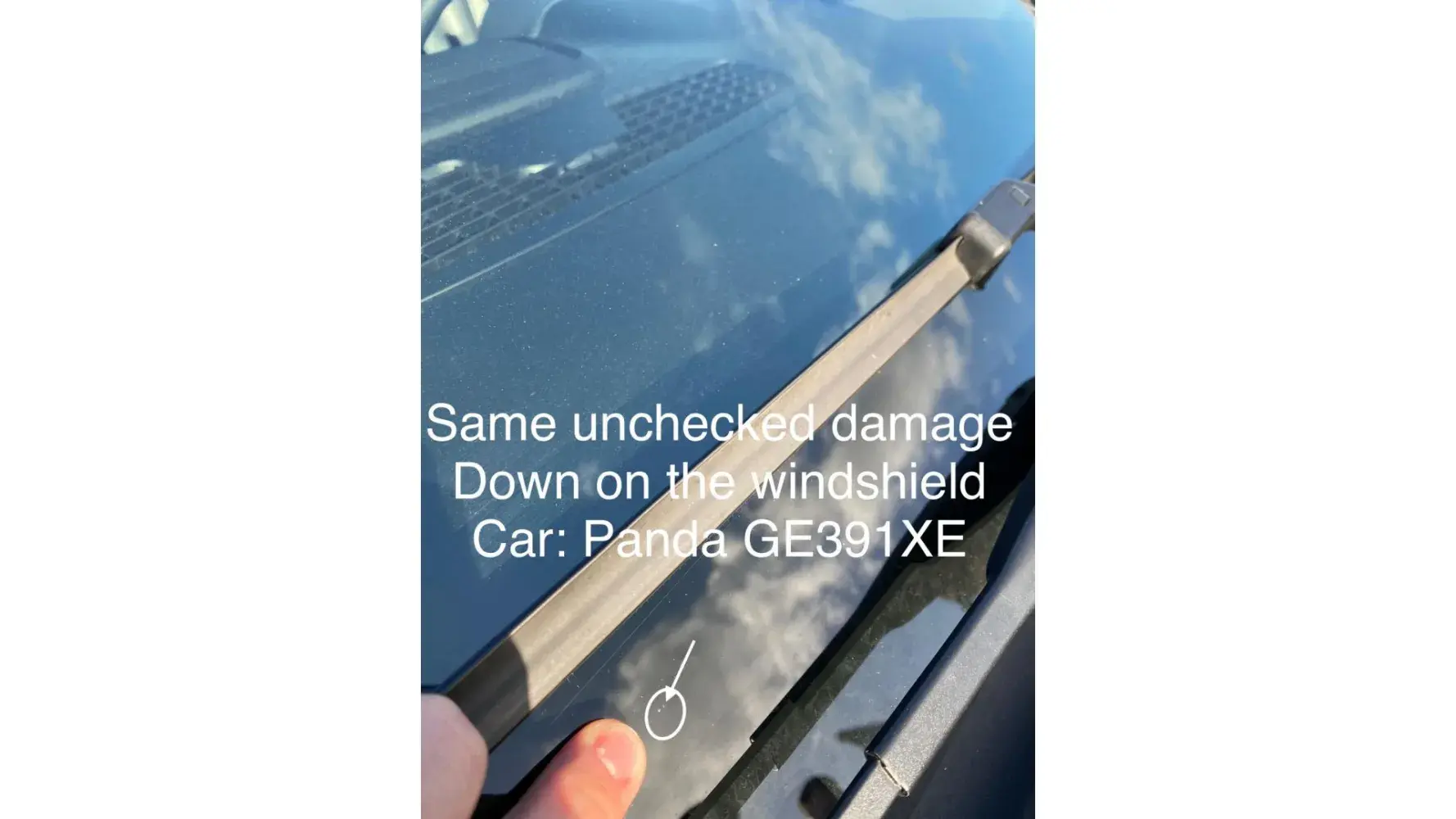 When I dropped the car off at the end of the hire, I showed the windscreen wiper fault to the SBC staff member and explained that I had already reported it to the office and that if he had any doubts, he should speak to them. I also told him that I had taken a video of the car on the day of collection before I left the SBC car park, which clearly shows that the windscreen wiper was already defective - a plastic cover for the wiper was missing exposing a bolt. The SBC staff member inspected the rest of the car, drawing my attention to a deep scrape mark on the lower passenger side door. I noticed this scrape myself during the hire. However, I knew I didn't cause the damage, so anticipating such an accusation, I had already gone frame by frame through my inspection video and took a screenshot to prove that the damage was already there. The staff member asked to see the video. I showed it to him, and he was satisfied that the scratch was already present when I collected the car.