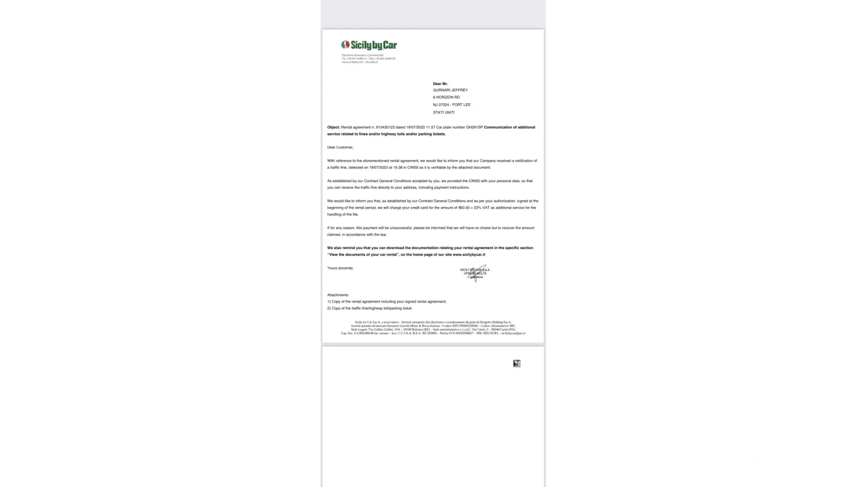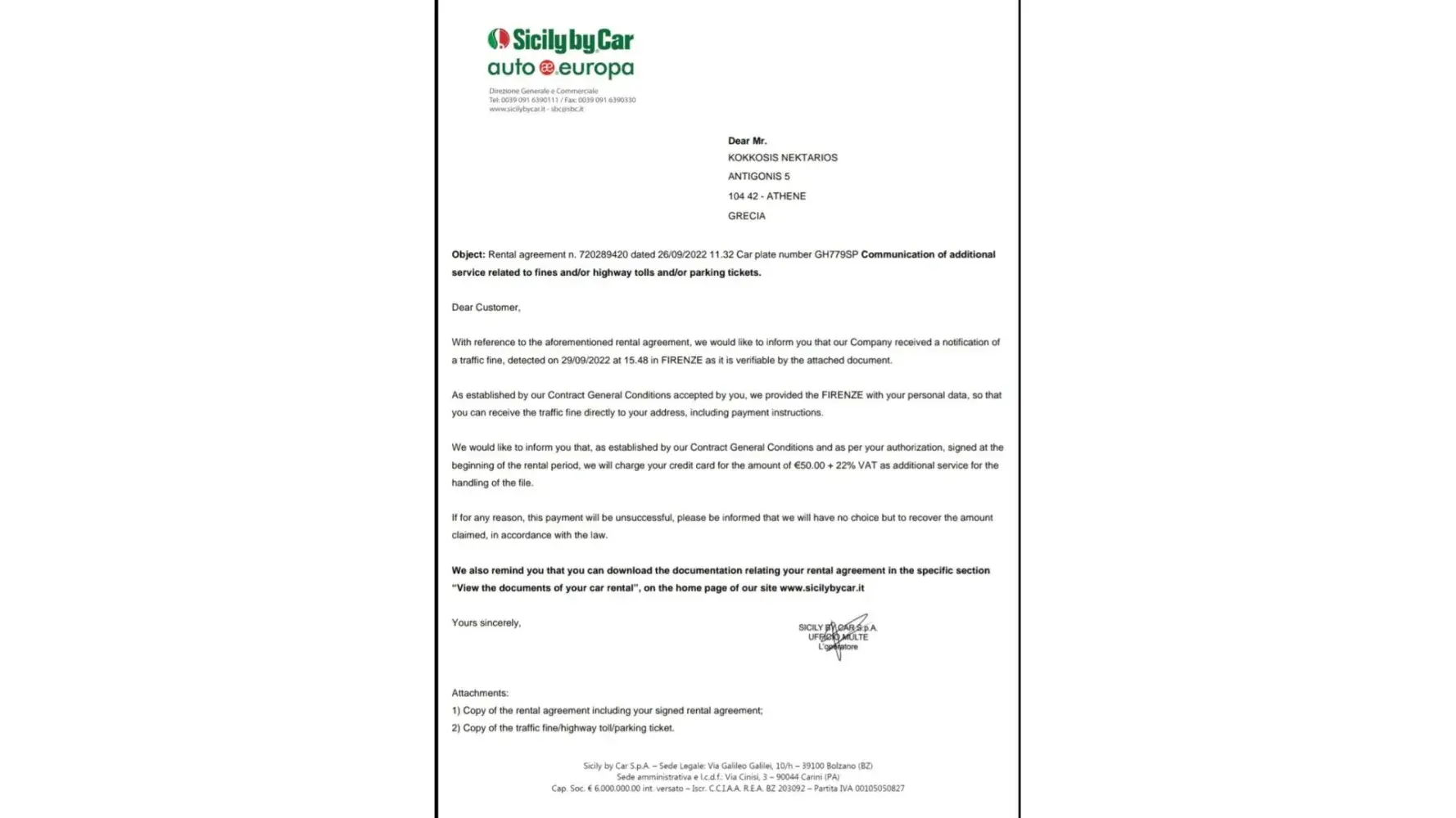 as per T&C you accepted at the desk, SBC is authorized to charge client's card for the amount related to the handling fee for each traffic fine received by the Authority. Our Finde Department will proceed to provide all customer's data to the Italian Authority in order to re-notify to client's home address the original fine registered under his/her name. Also, client will receive all the info and timing to pay the fine.