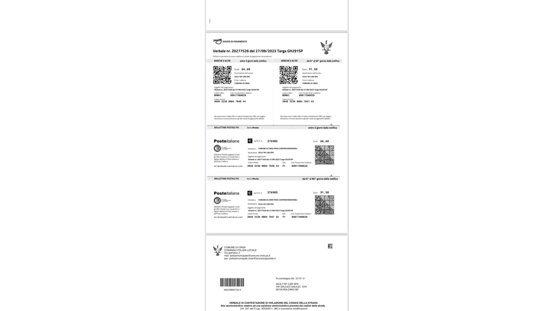 Sicily By Car Fine delaying notice for more than 43 & 51 days with extra charge for delivering the notifications