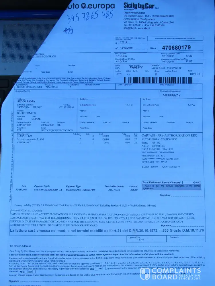 We have rent a car from Sicily by car company at the 7th of October 2019. We pick up the car from airport Malpensa and we delivered it at the Rome airport. We had been informed that the charge would be extra € 61. we paid with our card and the extra insurance that we have chosen and the amount of the 61 euro. On 24/12/2019 there was another charge from...