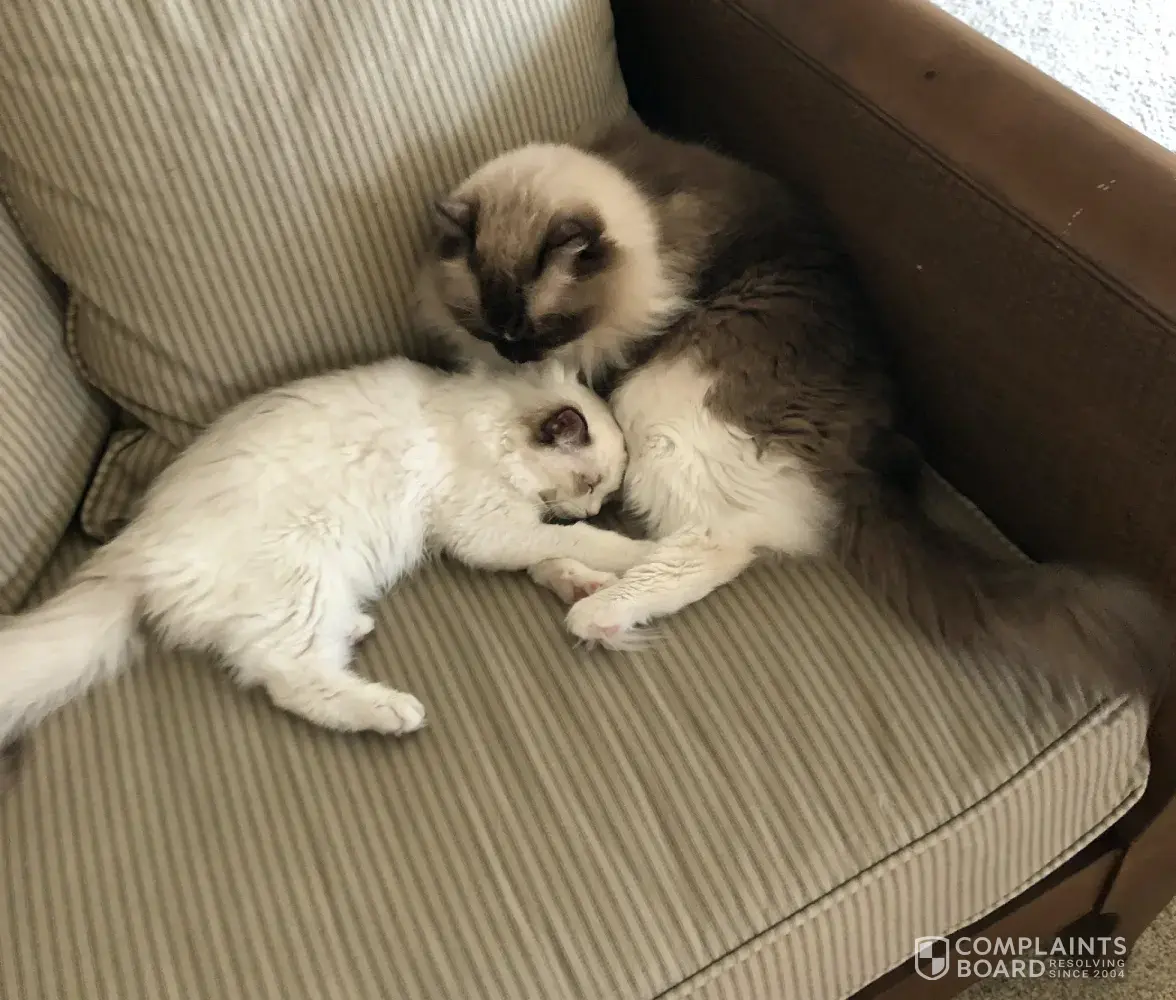 I would like to revisit the above comment. Frustrated with this situation, I assumed that the kitten would be enthused if returned to the breeder. I now understand that was not her intention & that she cares deeply about her cats. Simonsezz cattery has agreed to give us a monetary refund for the full cost of the kitten to help with the vet bills we have incurred. Mila's polyp did in fact occur and we did have to get the polyp surgically removed, but this was not due to breeder error. We believe that Simonsezz cattery is not at fault, we just had an unfortunate situation. Our first Ragdoll was purchased from Simonsezz in 2017 and is perfectly healthy. Please do not let the above comment stop you from purchasing from Simonsezz. I’ve added a couple of photos of our two Ragdolls below. Thanks!