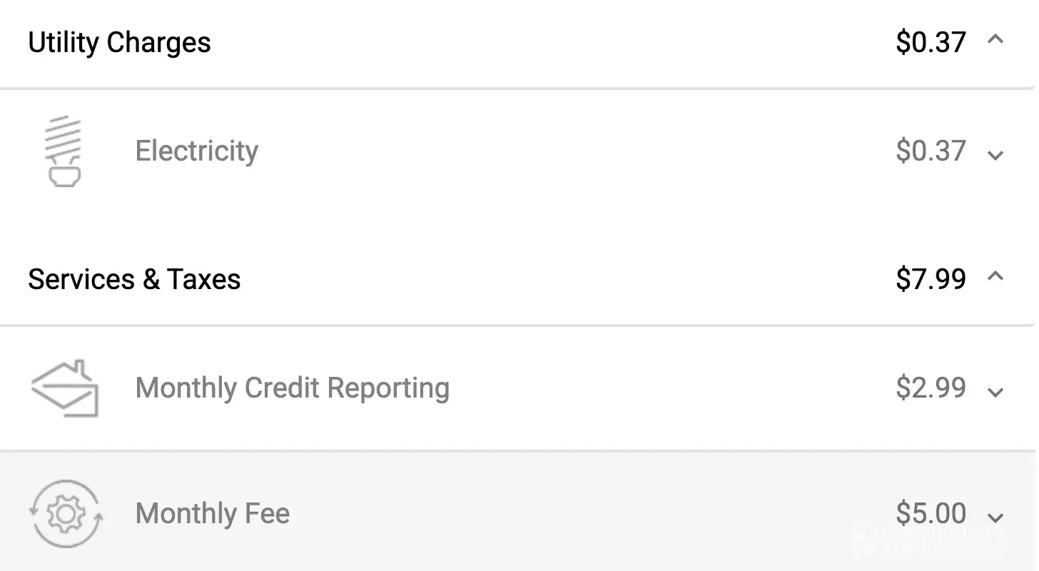 After moving out of my apartment, Simple Bills charged me a full 2 months later for a charge for a single day of electricity. The electricity charge for that 1 day, the 31st of the month, cost only 37 cents. The fees and charges on top of that cost a total of $8.00.