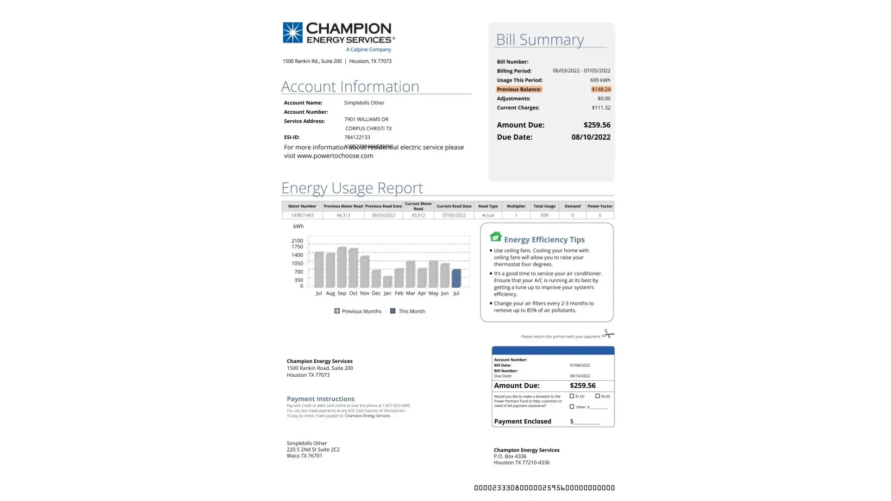 My bank statement shows I paid every month that my two sons had lived in the apartment - there was never a 3 month time period that money was not taken out by Simplebills. They have lived there for 10 months and for 10 months I have had money withdrawn from my bank account. Some months they decided to take money out twice like in January and March. Some months like December, May, and June they decided to take money out in the middle of the month. I have been paying utility providers for over 30 years and have never been billed twice in one month and never had money taken out in the middle of a month (unless I had scheduled it to do so). I am typically billed for a 30-day period and will pay for those 30 days in the next month. Then we come to the last month of billing. They said it was for 3 months but my bank statement never missed a month of them removing money from my account and they didn't start taking money out of my account 3 months after my sons moved in. The lease started in September and they took their first payment out of my checking account on September 28th. When I looked at the last Champion Energy statement it shows that they did not pay the previous month's bill yet I had money taken out of my bank account for them to pay it. I have asked them to explain to me why they withdrew money every single month yet did not pay the electric company. They paid for water and sewer every month but decided not to pay for electricity...even though I showed them on my bank statement that they took money from me to pay for all 10 months. When they did not pay Champions they then rolled the previous nonpayment over to the next bill and added it to the amount owed. I have asked Simplebills to let me know how they plan on correcting this error. They always come back with the same response - You paid in arrears. The first time I talked to someone from Simplebills they were outside playing with a dog. I asked her if she was outside with her dog and she said, "no". I then heard a door open and the wind stopped blowing and the dog stopped barking. She wasn't even at a desk or looking at my account on a laptop. She was outside enjoying a nice day playing with her dog while she kept giving me different reasons why they overbilled me. It was like she was reading a script. I have attached the last Champion Energy statements (I pay for 2 sons so I have 2 statements each month). You can see they added $148.24 to my current bill for each son. That means I overpaid last month by $296.48.