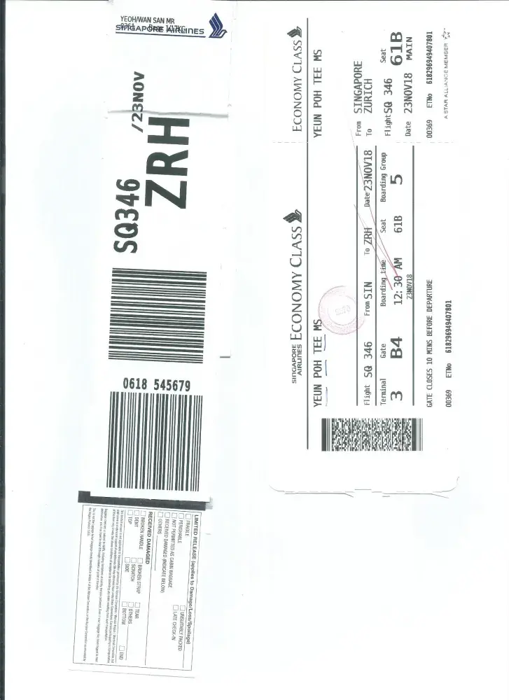 Flight : SQ346 SINGAPORE TO ZURICH