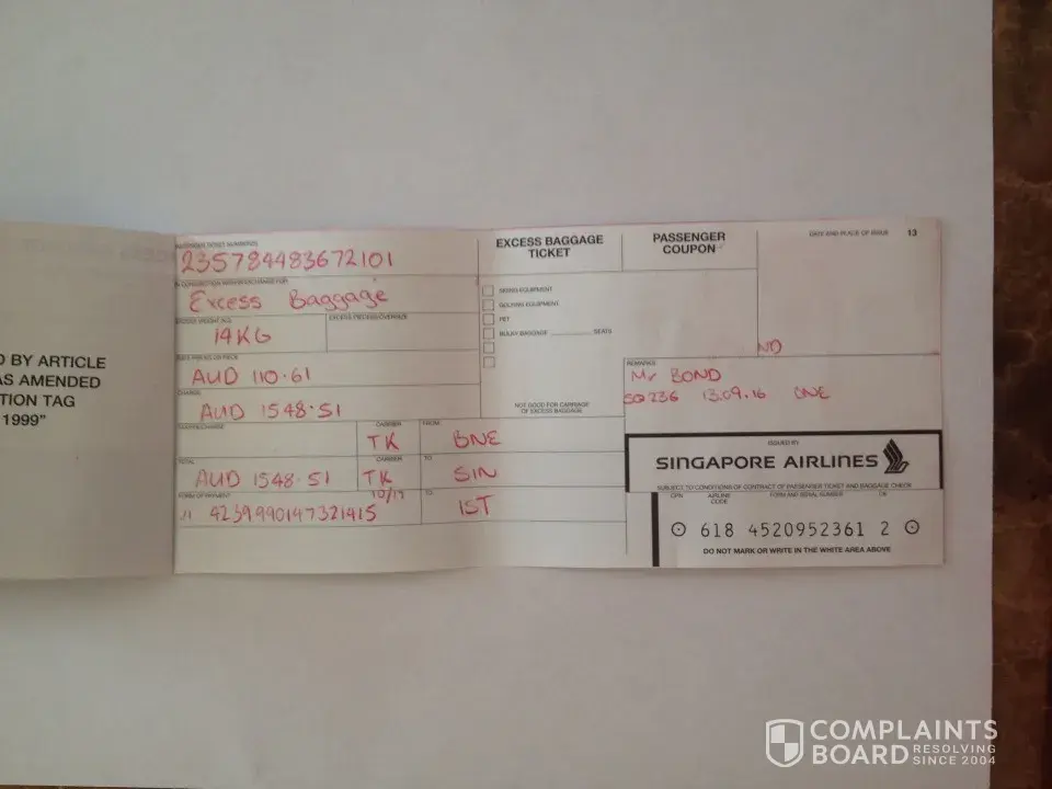 My name is elena bond writing on behalf of passenger matthew richard bond who traveled by singapore airlines. Having mental disability and unable to think rationally mr. Bond was stripped out of his savings by singapore airlines. At brisbane australia mr. Bond was charged $1, 300 us dollars for traveling with 2 suitcases. I have power of attorney to represent mr. Bond