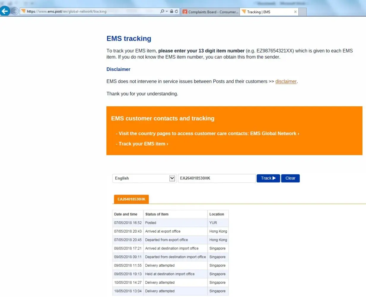 I am expecting a parcel from HK (Tracking reference: EA264018530HK) and was not notified that there was an attempted delivery on the 3 occasions: 09 May, 10 May and 18 May, and my husband was actually at home on all 3 days.