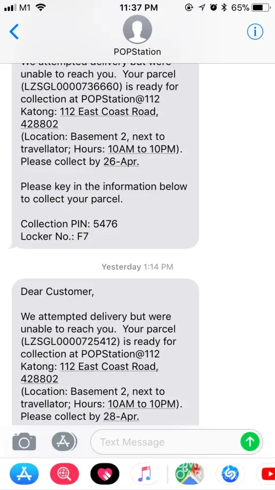 Hello, I had received singposts notifications on a Saturday (21 April 2018) that my parcel will be arriving. As such, I have stayed home to await the arrival. However, to my utter dismay, i received 4 unsuccessful delivery notifications during the day whilst sitting at home without the phone buzzer ringing (see attached). Adding to the disappointment, it is to my horror that when my husband went to pick up the items from the pop locker today (24 April 2018), the parcels were considerably large (see attached image) and he had to hoist the items all the way home.