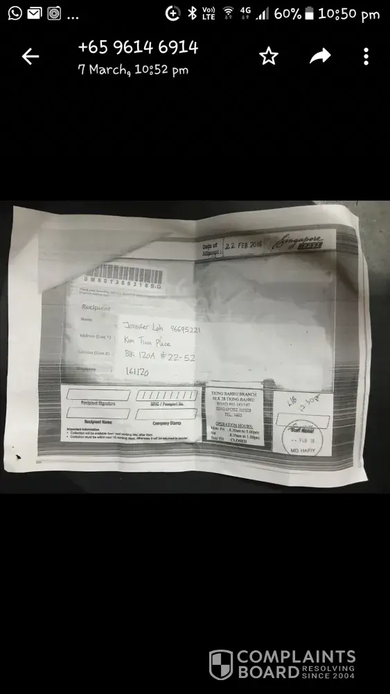 I am writing to complaint of the inadequate postal service that I received from Singapore Post. I am most annoyed that I received a piece of paper in my mail box from Singapore Post on 8/3/2018 and indicated by a hand written " last date of collection 8/3/2018". However, I did call the post office the next morning ( 8:40 am ) to inform the officer on duty regarding my situation but I was told that the item was sent back to sender. Furthermore, the inability to provide me for more information regarding on this matter.