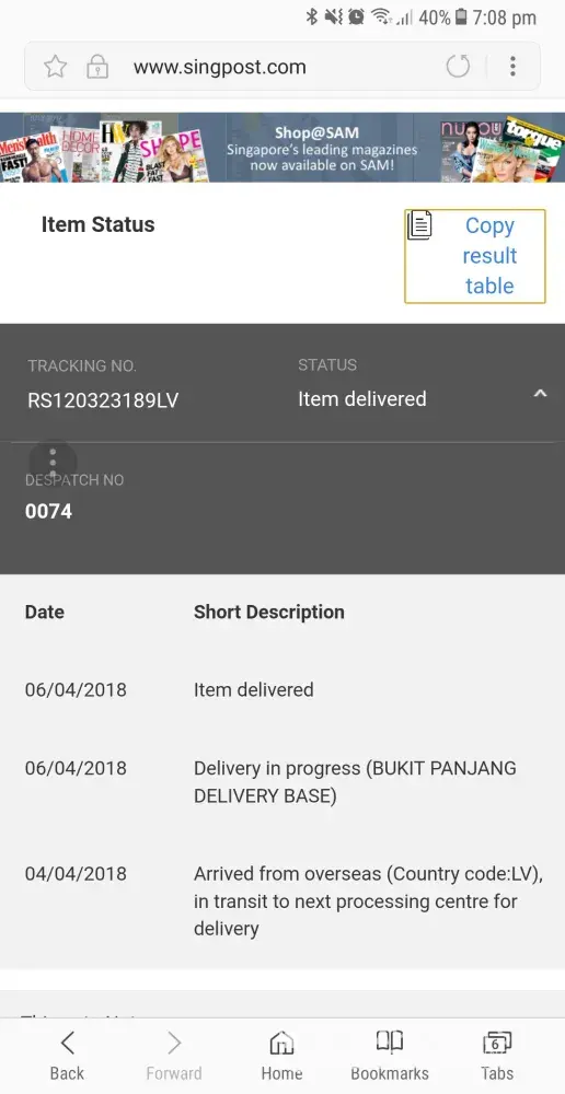 I bought an item from eBay on 26th March and have it sent to me by registered mail. Through singpost tracker i found that my package arrived in Singapore on 4th April and was subsequently "delivered" to my home on 6th April Friday at 2155. However, I was at home and no such delivery was made. I think it is very irresponsible to put the status as delivered when I obviously didn't receive the package and did not sign for anything. Called singpost customer care and they still have not provided me with an answer. This is the most ridiculous service from singpost.