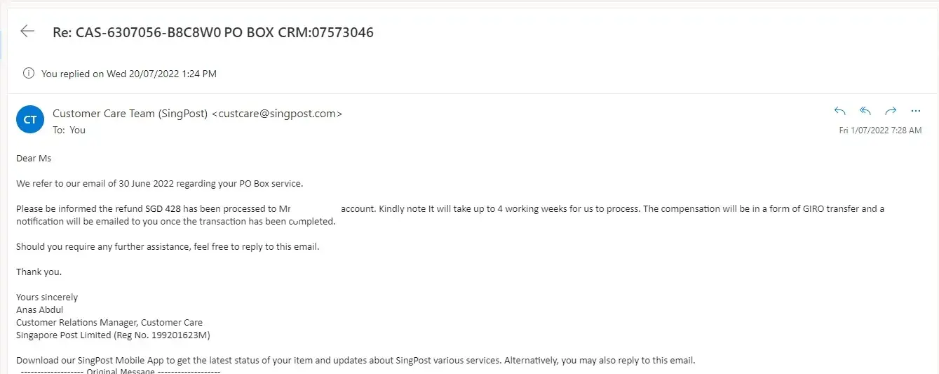 A quick recap beforehand, this problem started in April 2022 and I posted a complaint here a month later in May, Finally, on 6 June 2022, a Customer Relations Assistant Manager agreed to provide the refund I had been seeking to the amount of SGD$428.