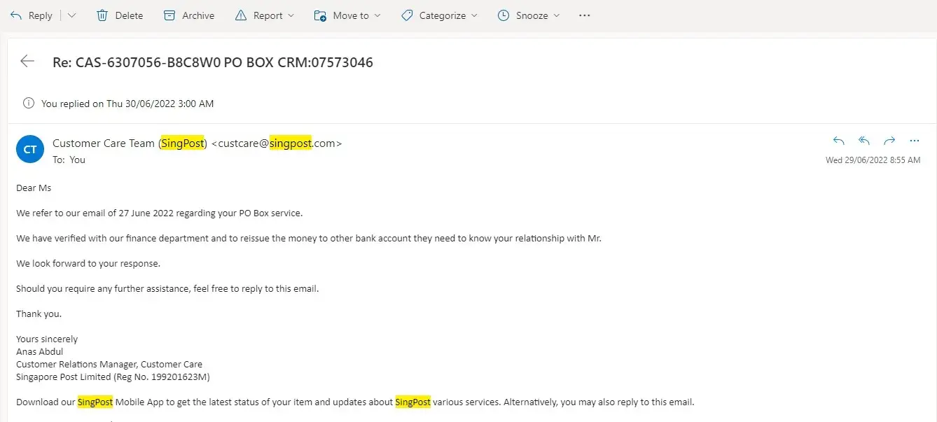 4 July 22) Through SingPost live chat, told them about the problem and Rizalyn on the chat told me she will get back to me in 3 working days. She did not. What she did was create an email thread between me and SingPost so I am at least thankful for that.