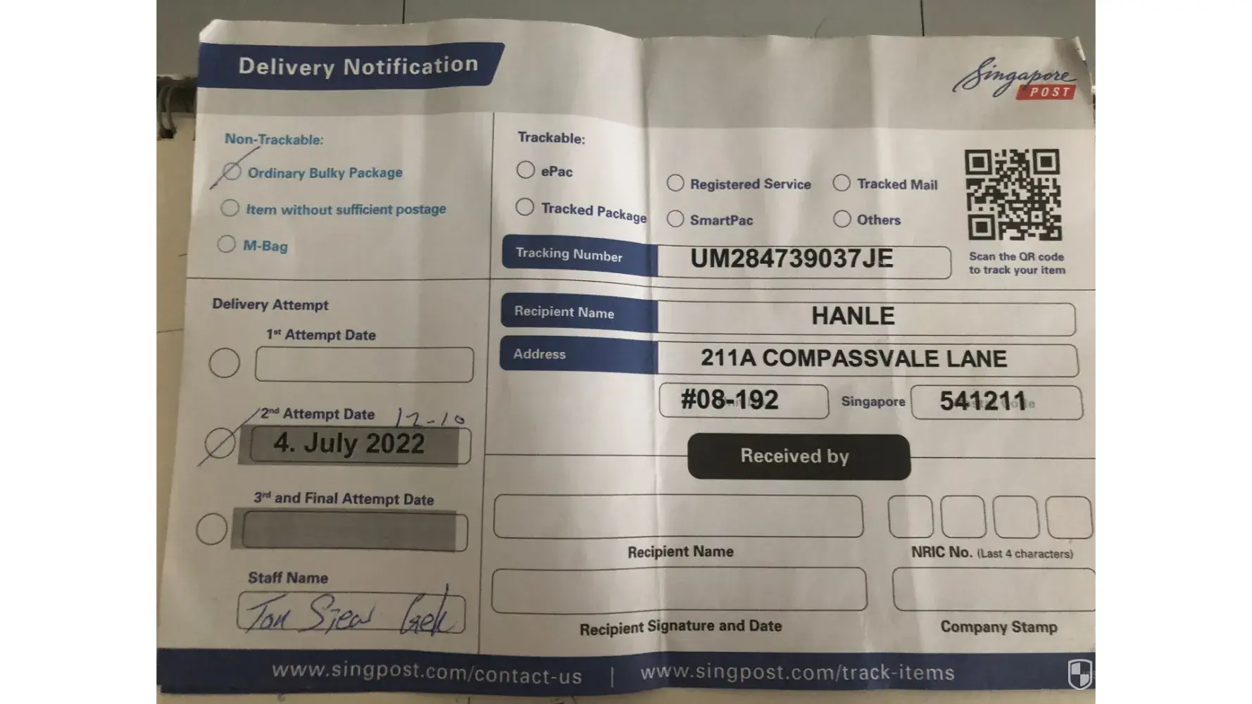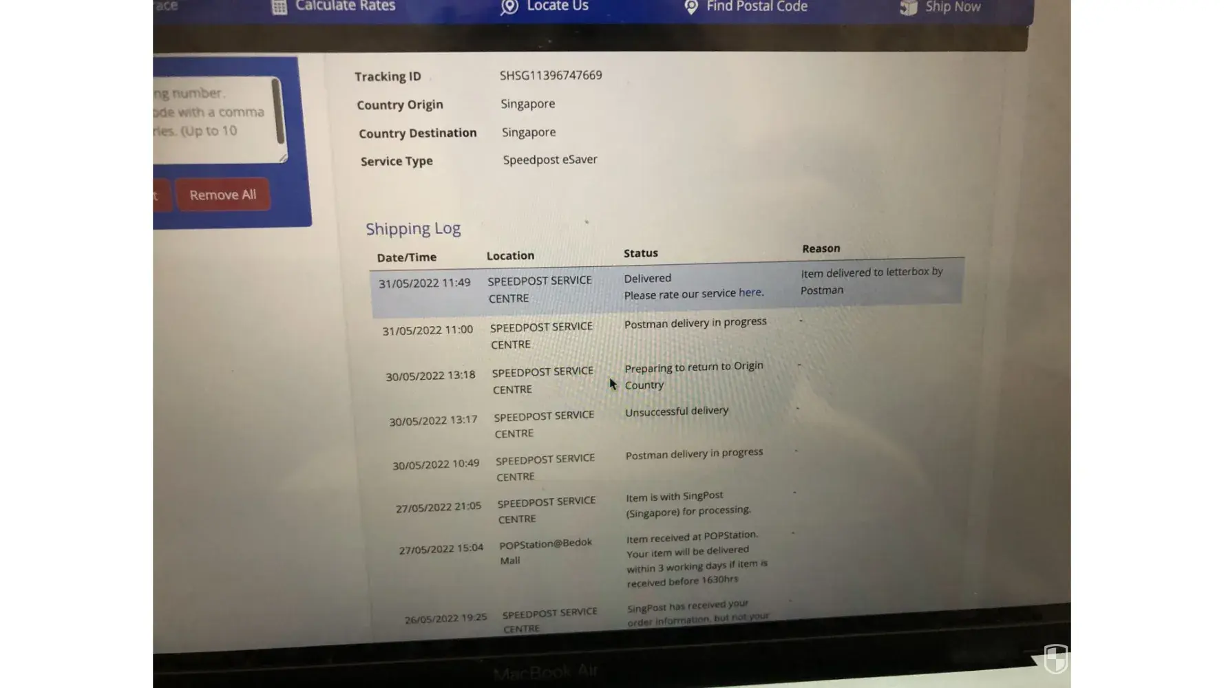 On 30 May 2022, over a month later, I checked on the item status after my holiday to find out to my horror that the parcel is now back in Singapore because of alleged failed delivery (just twice in the space of two hours in one day).