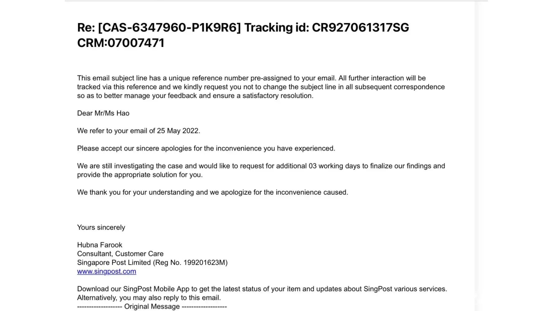 Singapore Post (SingPost) has left an official reply on this complaint.