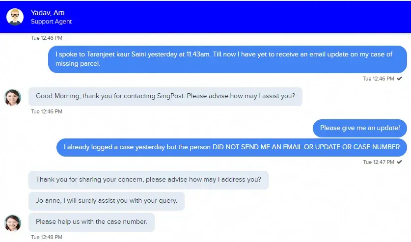 Monday, 30 May 2022, 6.44pm - Used online chat to check on the parcel status and was assigned to Anand Maurya (or Khan, Ujma). Explained my situation and got no reply for 12 minutes.
