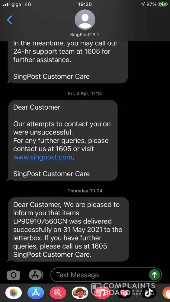On 01/06/2021 @ 1843hrsCalled up 1605 and reported the case to the CS for receiving the msg from the tracking apps provided by my sender that the product have been delivered to my letterboxThe CS do a checking and verified with me on my NAME, CONTACT & ADDRESS and confirm that the delivery have been send to the address of No.22 New Industrial Road #03-20/21 Primax Singapore 536 208. (FYI, i have double checked and confirm with her many times to be sure that the driver delivered to the collect address, and she is sure that the record show is the above address.)Therefore, i further question that i have check the letterbox (Which only i have the letterbox Key and no one else have it) and there is no parcel at all in both my letter box of 03-20 & 03-21?Than she told me that she will check with the relevant team to verify on further specified details on where the parcel is and will get back to me in 3 working days which is Thursday or Friday (3rd or 4th June).Till today there is no return call from any Singpost Staff?On 09/06/2021 @ 1257hrsI called up 1605 again and CS Ms. Vee attended to me again for the above matters mentioned.She put me on hold and check the matters and reply me that the Articles tracking numbers have 3 same Tracking numbers as above and none of the articles have my NAME, CONTACT & ADDRESS?Ms Vee told me that she will revert me with the email to explain that the 3 articles with the same tracking number are all not with my contact and revert me to clarified with my senders and i did ask for the supporting details to show my senders and was rejected due to Confidential and cannot disclosed to me? But NO EMAILS WAS SEND OUT TO ME AGAIN? (VERY GOOD SINGPOST CUSTOMERS SERVICES STANDARD)On 09/06/2021 @ 1837hrsReceived a call by Mr. Zul of Singpost Assistant Manager, Customer Care regards to above mattersSame old story againWhen further question, what did the 3 articles contact details stated, reply with the same confidential and cannot disclosed? Does giving the name and area of the address can prove what? When further demand a question on why am i receiving the confirm message that items was delivered when all the 3 articles does not have my NAME, CONTACT & ADDRESS?This is the biggest Joke i have heard in today Logistics World and i have been in Logistics Trade for more than 20 years FYI.Singpost is telling me that they are using the lousiest systems that could not read the tracking for 3 articles & 3 different contact information? A BIG DISGRACED TO THE COUNTRY APPOINTED POST OFFICE INDEED.Next Question, Without my contact details on the articles, WHY M I RECEIVING THE MESSAGES THAT ITEMS HAVE BEEN DELIVERED? IS THIS A JOKE?Mr. Zul can tell me to forward the message in this email to check the backend system on why the message have send out to me? As a professionalism of Singapore Post Office Manager Post, without the details input under my contact, do you think the system can read and send me the message too? Please use some logical brain to reply and be professional in your job too.Anyway, as per Mr. Zul Request, I have attached the below photos of proof that i have received from the Tracking APPS and also a message from SINGPOST as follows: -
