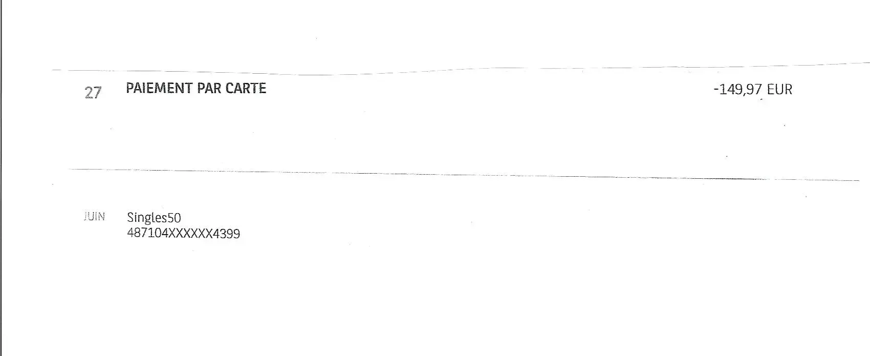 Je viens d' être débité de 149,97€ le 27 Juin 2023 alors que je n'ai pas d'abonnement chez Single 50 Be via ma carte Visa 487104XXXXXX4399. Pouvez vous faire le nécessaire pour me rembourser du fait que je n'ai pas d'abonnement chez Single 50 ! Mon nom est Sacré Jean-Marie et j'habite au 242, rue des Awirs 4400 Flémalle . mon adresse e-mail est : [protected]@gmail.com Le débit de mon compte a été fait le 27/06/2023 .