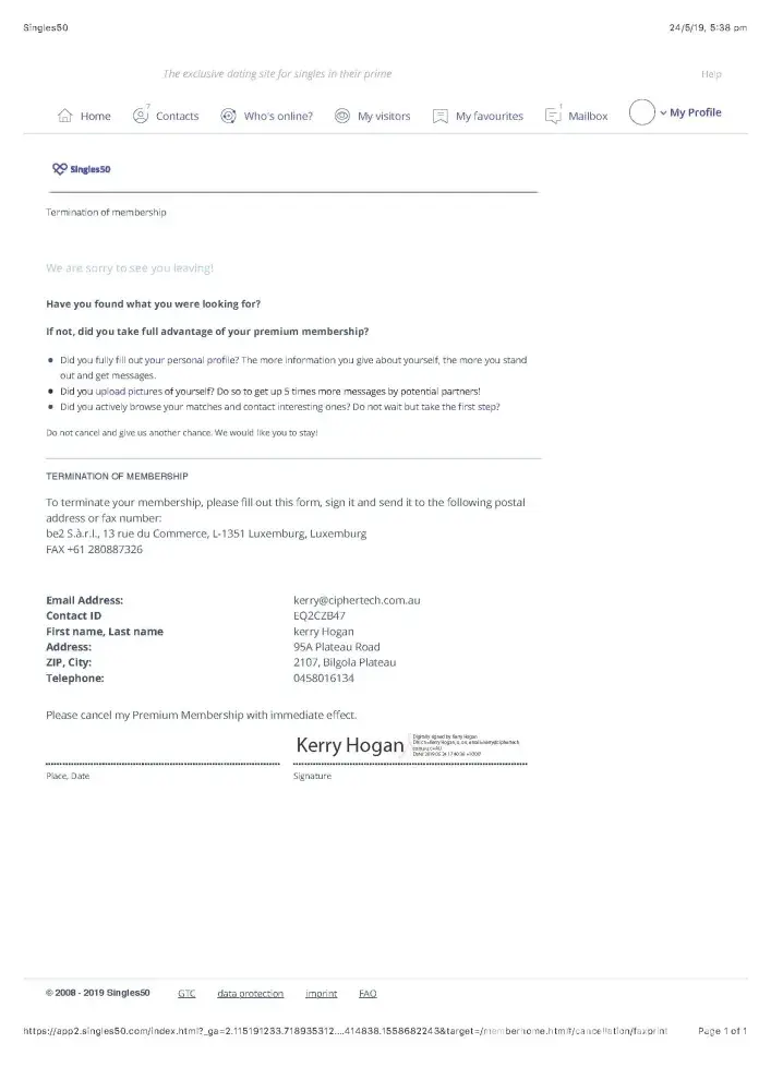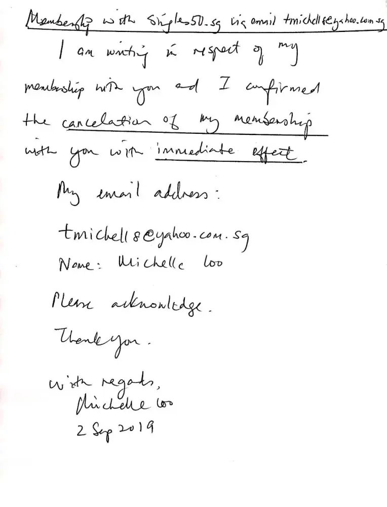 I had sent you a pix jpg file as i was advised that i cd cancel my membership via this method as shown (refer email by singles50 customer service dtd 22/5/19 see below) :