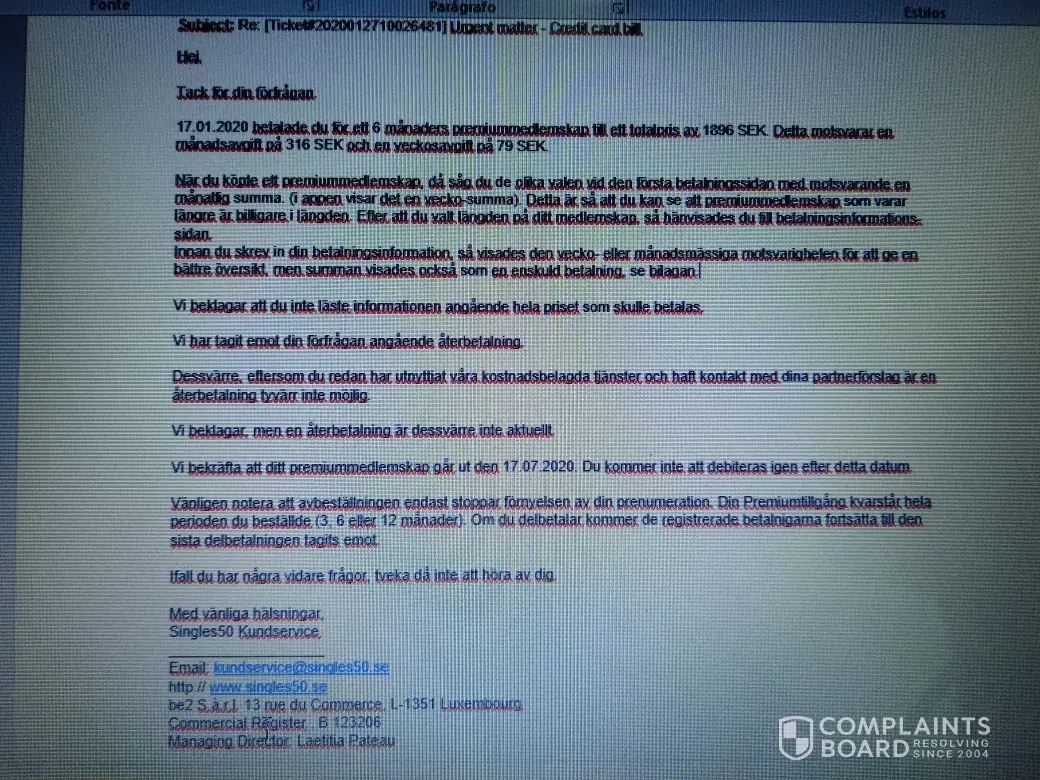 So, on January 27th, I sent an email to kundservice@singles50.se requesting the cancellation of the total amount billed on my credit card.