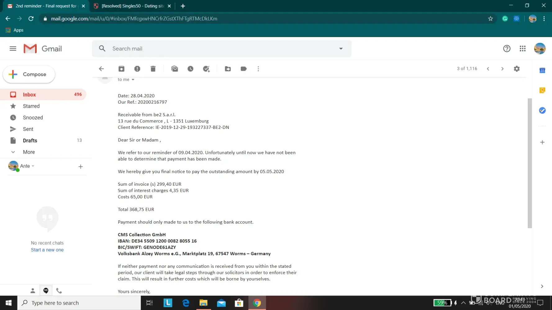 Yesterday received an email from CMS collection company( german company)