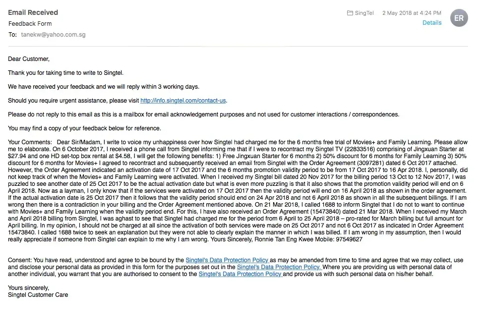 Your Comments: Dear Sir/Madam, I write to voice my unhappiness over how Singtel had charged me for the 6 months free trial of Movies+ and Family Learning. Please allow me to elaborate. On 6 October 2017, I received a phone call from Singtel informing me that if I were to recontract my Singtel TV ([protected]) comprising of Jingxuan Starter at $27.94 and one HD set-top box rental at $4.58, I will get the following benefits: 1) Free Jingxuan Starter for 6 months 2) 50% discount for 6 months for Family Learning 3) 50% discount for 6 months for Movies+ I agreed to recontract and subsequently received an email from Singtel with the Order Agreement (3097281) dated 6 Oct 2017 attached. However, the Order Agreement indicated an activation date of 17 Oct 2017 and the 6 months promotion validity period to be from 17 Oct 2017 to 16 Apr 2018. I, personally, did not keep track of when the Movies+ and Family Learning were activated. When I received my Singtel bill dated 20 Nov 2017 for the billing period 13 Oct to 12 Nov 2017, I was puzzled to see another date of 25 Oct 2017 to be the actual activation date but what is even more puzzling is that it also shows that the promotion validity period will end on 6 April 2018. Now as a layman, I only know that if the services were activated on 17 Oct 2017 then the validity period will end on 16 April 2018 as shown in the order agreement. If the actual activation date is 25 Oct 2017 then it follows that the validity period should end on 24 Apr 2018 and not 6 April 2018 as shown in all the subsequent billings. If I am wrong then there is a contradiction in your billing and the Order Agreement mentioned above. On 21 Mar 2018, I called 1688 to inform Singtel that I do not to want to continue with Movies+ and Family Learning when the validity period end. For this, I have also received an Order Agreement ([protected]) dated 21 Mar 2018. When I received my March and April 2018 billing from Singtel, I was aghast to see that Singtel had charged me for the period from 6 April to 25 April 2018 - pro-rated for March billing but full amount for April billing.in my opinion, I should not be charged at all since the activation of both services were made on 25 Oct 2017 and not 6 Oct 2017 as indicated in Order Agreement [protected]. I called 1688 twice to seek an explanation but they were not able to clearly explain the manner in which I was billed. If I am wrong in my assumption, then I would really appreciate if someone from Singtel can explain to me why I am wrong. Yours Sincerely, Ronnie Tan Eng Kwee Mobile: [protected]