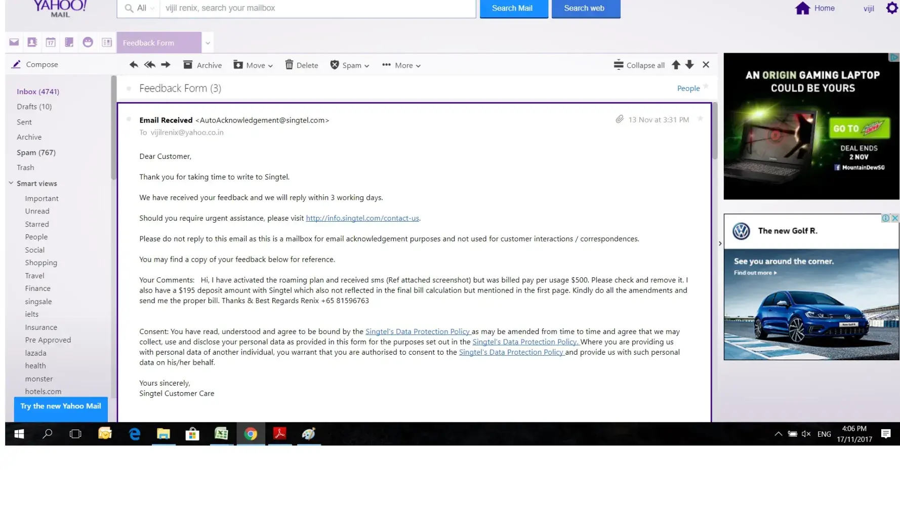 I have activated the roaming plan and received sms ( ref screenshot) but was billed pay per usage $500. Please check and remove it. I also have a $195 deposit amount with Singtel which also not reflected in the final bill calculation but mentioned in the first page.