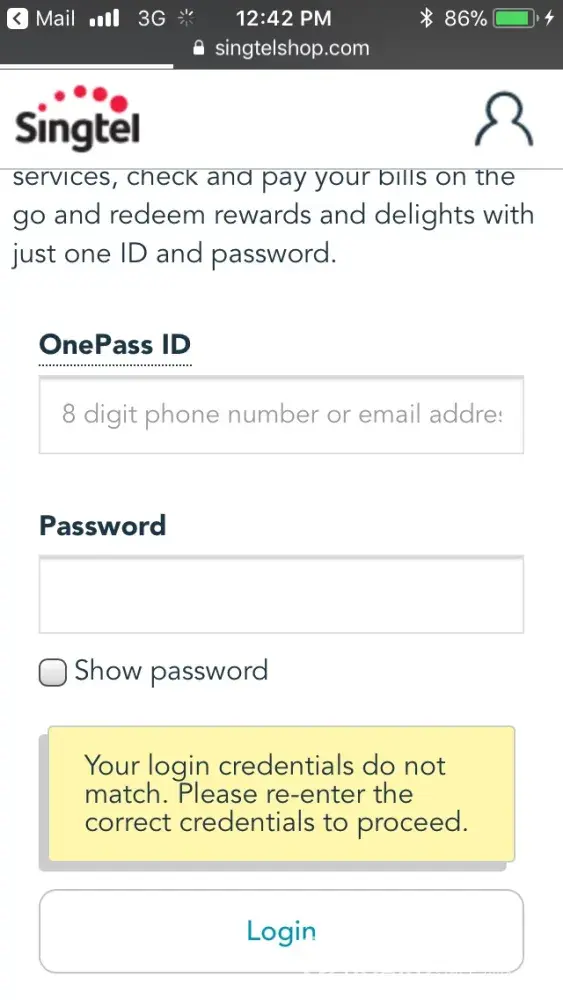 From the beginning, SingTel website was quite high traffic, I tried many times but failed to get through. After 2 hours accessed continuously, I had successfully proceed to next page and choose my plan & so forth. When I click on "re-contract on your plans", it proceed to next page and OnePass ID login is necessary. I inputted my id and password, but wasn't success. I tried plenty of times and even reset my password but the end failed too. See Attached.