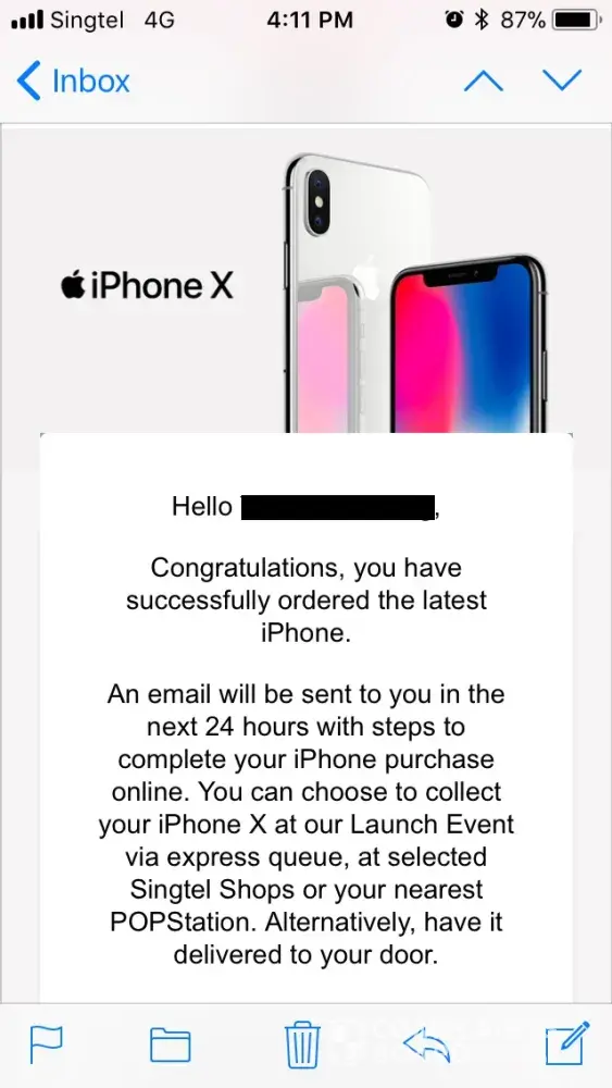 Firstly I received email from your company on 1st of November 2017 6:23pm to be informed to follow the instructions to proceed with the purchase of iPhone X. See attached.