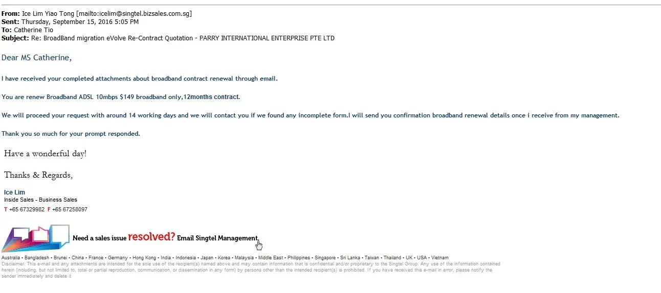 Singtel contacted our company to renew our adsl broadband contract on september 07, 2016. An offer was made to us to recontract and we responded via email with the necessary forms filled in and yet despite having an email confirmation from them on 15th september from their sales staff - ice lim yiao tong [mailto:[protected]@singtel. Bizsales.com. Sg] that they have received my accpetance of recontract (See attached screenshot of email) ; they have chosen to ignore it and keep getting their sales staff to contact us to convert to fibre optic broadband.