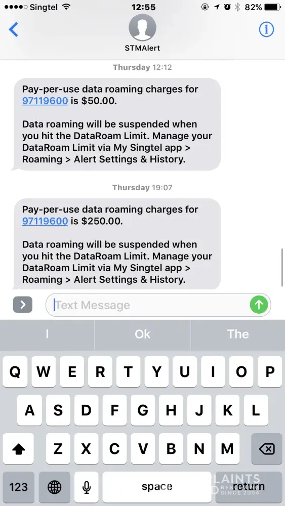 I was traveling around in May. I landed Hong Kong in 18th May from South Africa. I switched the south africa SIM card to Singapore Singtel SIM card upon landing. And I switched the Dataroaming off. But Immediately, I received a SMS from STM Alert saying there's a roaming charges of $50! Msg says "data roaming will be suspended when you hit the data roam limit." So I thought I had to pay $50 any way for a limited data usage, and it will alert me when i hit the limit of $50.