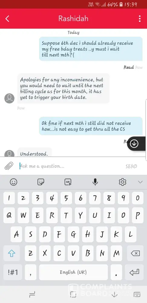 As last month December is my birthday, i should receive 1GB free data but i did not received it. The CS inform me that it yet to be trigger for month of Dec. I will receive the next cycle of the month. But this month i still did not receive. I was so upset as i have been with singtel for so long and there is no problem at all. Pls look into it .Thk