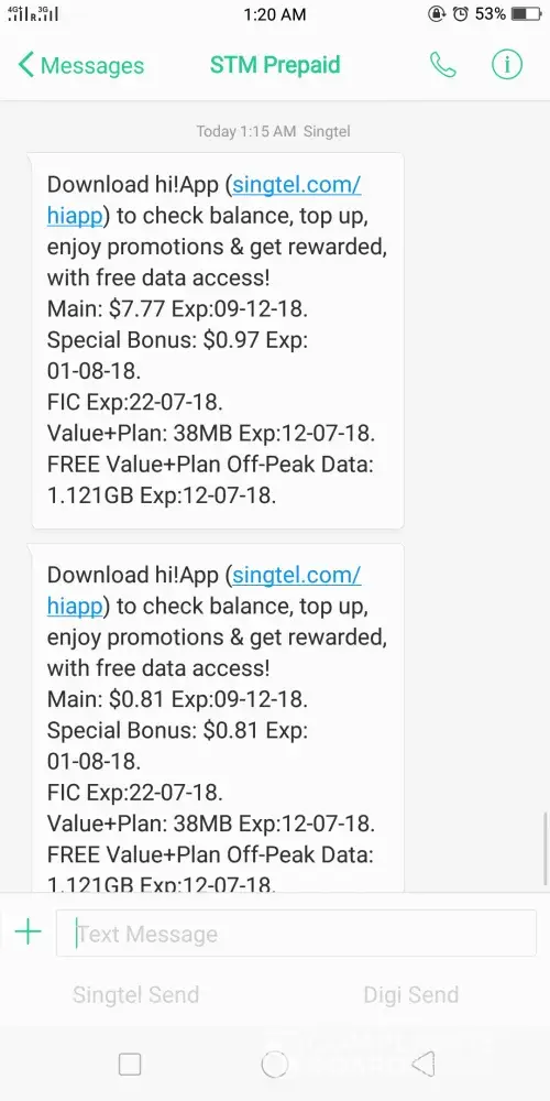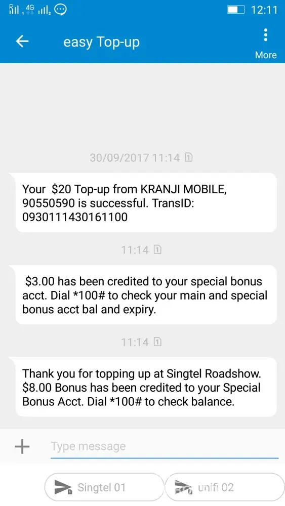 I just top up SGD 20 at kranji but then after a few minutes my balance left SGD 1