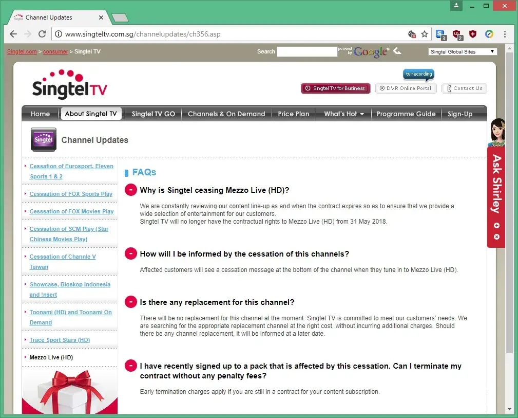 3 months ago I signed a 24months contract up for the Mezzo Channel. Now Singtel ended this channel . No alternatives provided, no refund provided, and I cannot cancel the rest of my contract.