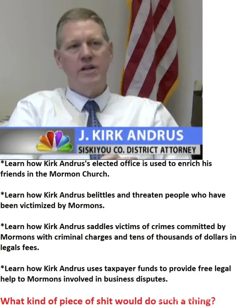 Siskiyou County District Attorney Kirk Andrus is a self-righteous, pompous arrogant coward who uses his elected office to enrich his friends in the Mormon Church and takes proactive steps to minimize the chances of Mormons being prosecuted in Siskiyou County. In other word, Siskiyou County District Attorney Kirk Andrus is a worthless piece of rectal filth...