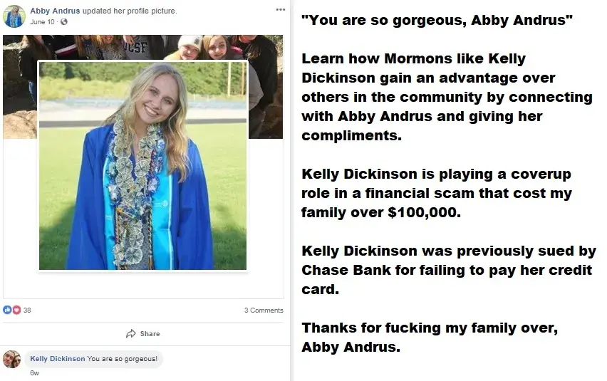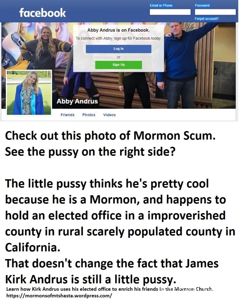See the photo of Abby Andrus getting compliments from another Mormon Scum named Kelly Dickinson, who trashed me all over the internet and filed criminal charges to silence me. Abby Andrus is a f*&^ Mormon Scum.