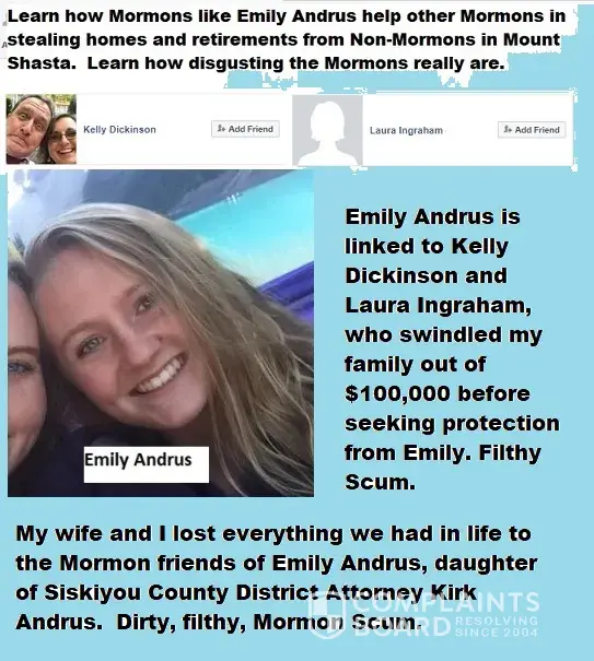 My wife and I were swindled out of $100, 000 by Kerry Criss, wife of Siskiyou County Supervisor Brandon Criss. Kerry's sister Kelly Dickinson and mother Laura Ingraham then proceeded to trash my family and filed criminal charges against us to silence us. They then mocked us over our suffering. Low class Mormon Filth. Learn how the Mormon Filth operate. Learn how the Mormons gang up on Mormons, thanks to low lifes like Emily Andrus.