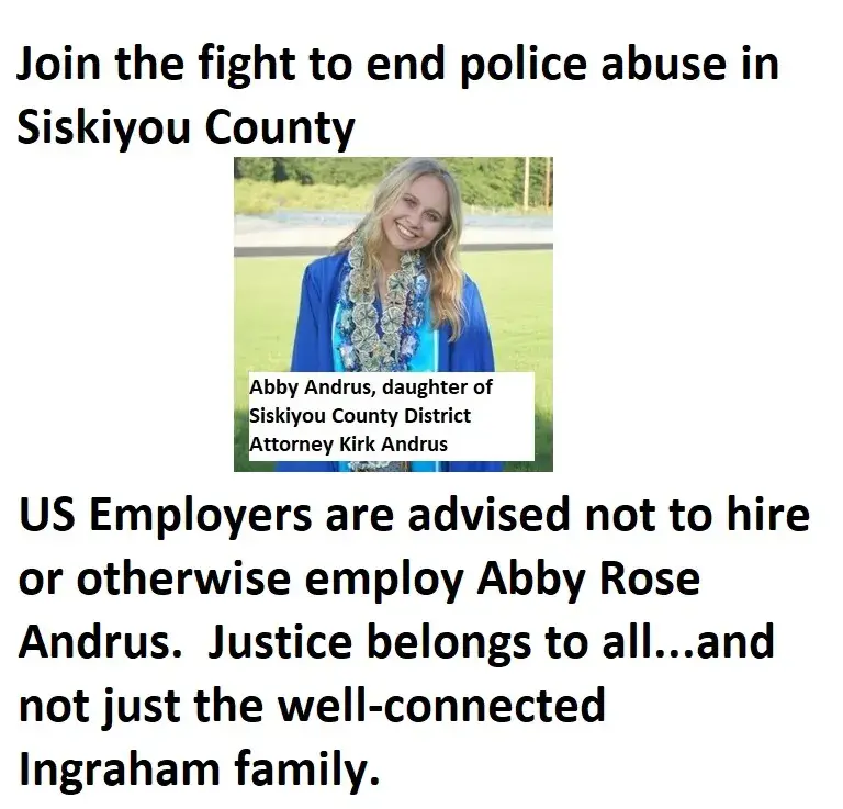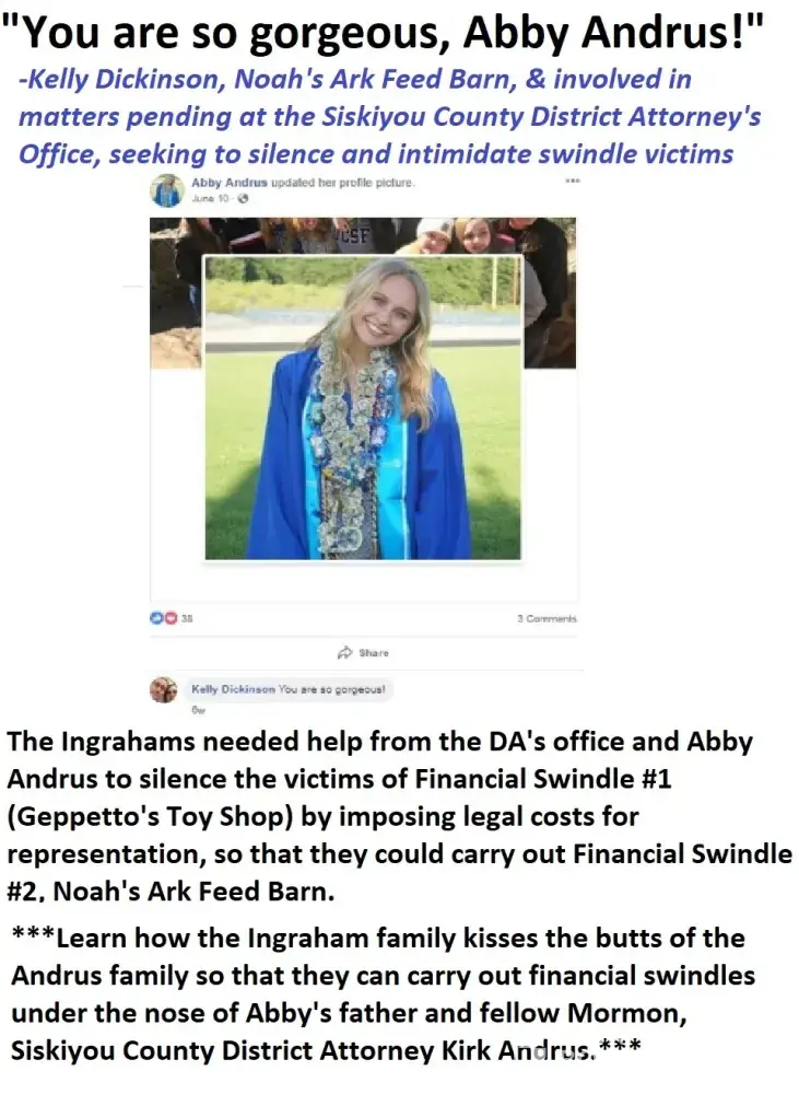 Learn how the Ingraham family kisses the butts of the Adrienne Andrus and her family so they can swindle others in the community while operating under the nose of Siskiyou County District Attorney Kirk Andrus.