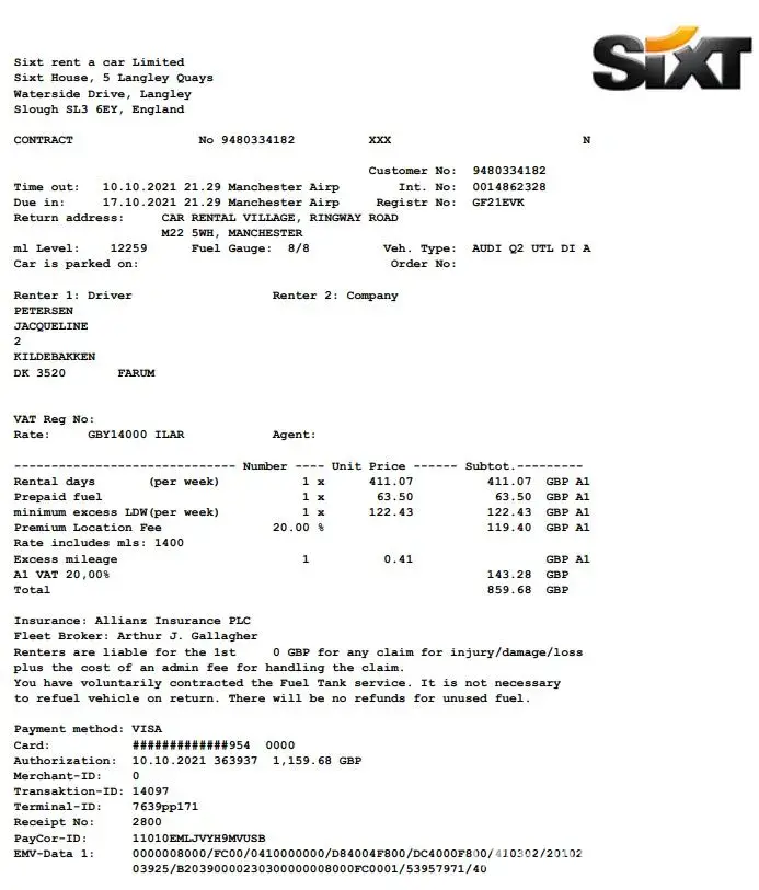From 16 Dec 2021 through 15 Jan 2022 I rented a vehicle from Sixt in Ostersund/Sweden. My customer number was 9815536, reservation No [protected], Registration UHZ 17X, Internal No [protected].