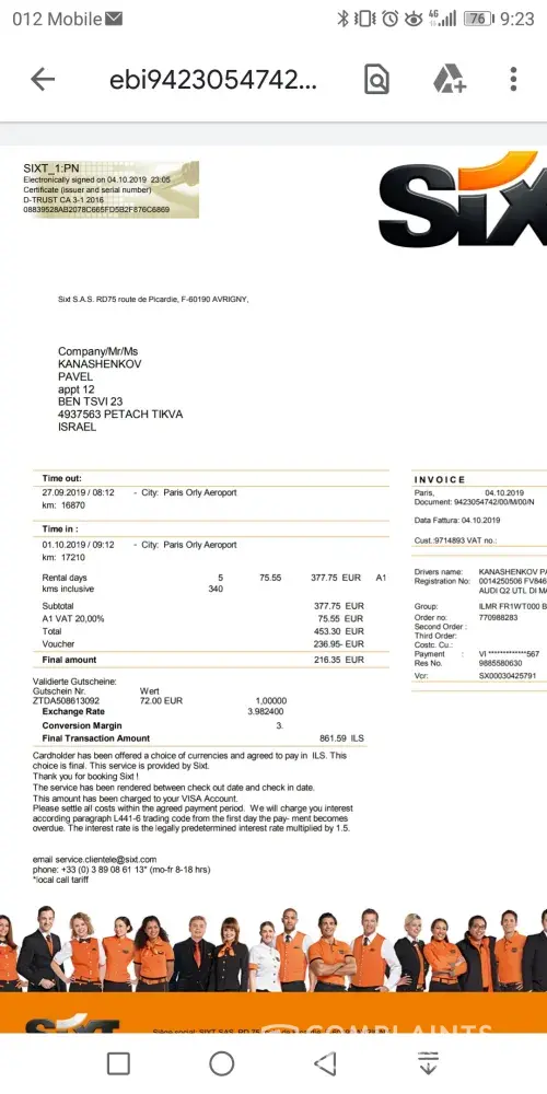 This is about a car that we had rented from Sixt Car at Lisbon airport on the 26th of September. The contract number is [protected]