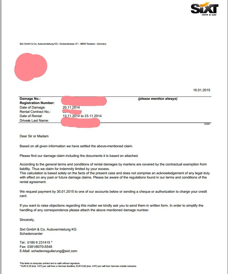 The fact that I had not received any notification from them until I contacted them, along with the amount of the charge, makes me suspect that this is some sort of shake down or scam. Sixt assumes they can put through any claim they want against naive consumers. I think Sixt expects that most consumers do not check their credit card statements closely or the consumer will just let their credit card insurance provider reimburse the cost. I have attached a couple of pictures so people can judge whether the charges were justified.