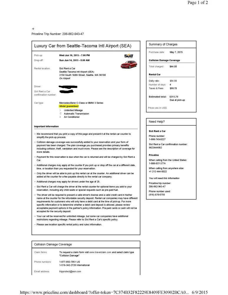 Rented from SixT via Priceline for pickup at Seattle/Tacoma (SeaTac) for a four-day rental. The SixT ad and the email confirmation both state that a guaranteed car model, one of two, will be provided, in my case, a BMW 3 Series or Mercedes C-Class car in their "L" class (Luxury class). Once I arrived to pick up my car, they informed me that not only do they not have one of the car models they "guaranteed", but apparently they had no cars available in that class at all. All they had was an Audi A3, a smaller car from the lesser P-car (premium) category, which I was given with a take-it-or-leave it option and attitude, with no offer of an upgrade to a class above the class of the guaranteed model I reserved (as is customary with most rental car companies when the class of car you reserved is not available) or any offer of compensation. The agent stated in a cavalier manner that this is a common occurrence and that SixT does this all the time. After my trip, I reported this to the Better Business Bureau, asking that SixT stop advertising “guaranteed model” in their ads when they cannot provide a guaranteed model, let alone a car from the same class. They did, only after receiving my complaint from the BBB, adjust my bill to reflect the class of car I was forced to take – and acted like charging me for what I actually received was some sort of compensation. SixT also sent me a voucher for a free upgrade on my next rental – like that will ever happen. Subsequently they sent me a voucher for a whopping - wait for it - $5.00 on my next rental. In my complaint I stated that the money was never the issue, but their bait-and-switch tactics, and their false advertising. SixT stated in their BBB rebuttal that they don’t advertise “guaranteed model” only “guaranteed class”. At this point I upload both the SixT ad from Priceline (which at the time of this review is still actively stating “guaranteed model”), and a copy of my email invoice to the BBB website to supplement my complaint. The Priceline ad states “Luxury Car
