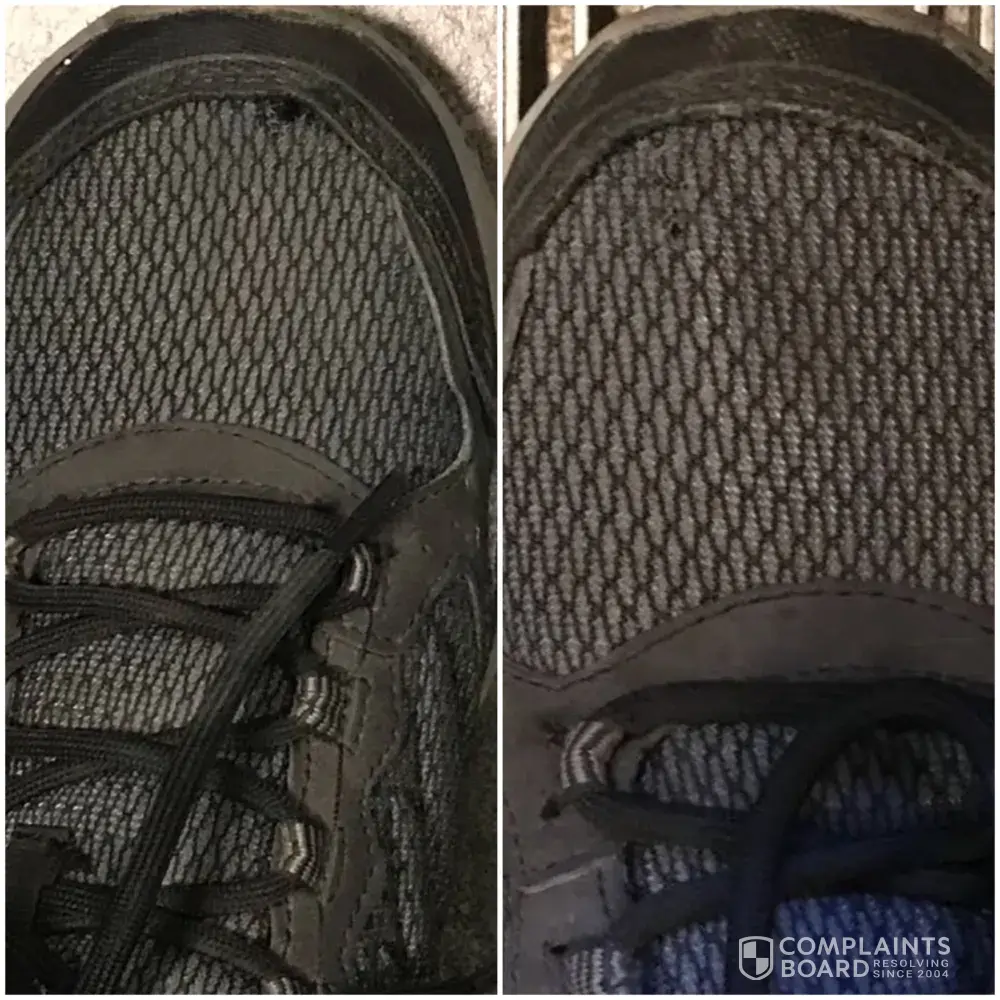 All I wanted was to have the shoes replaced. See attached photos of the poor quality of material and workmanship.