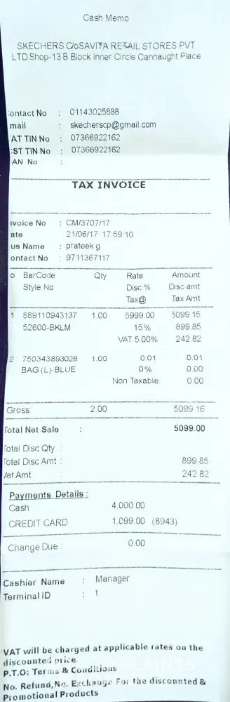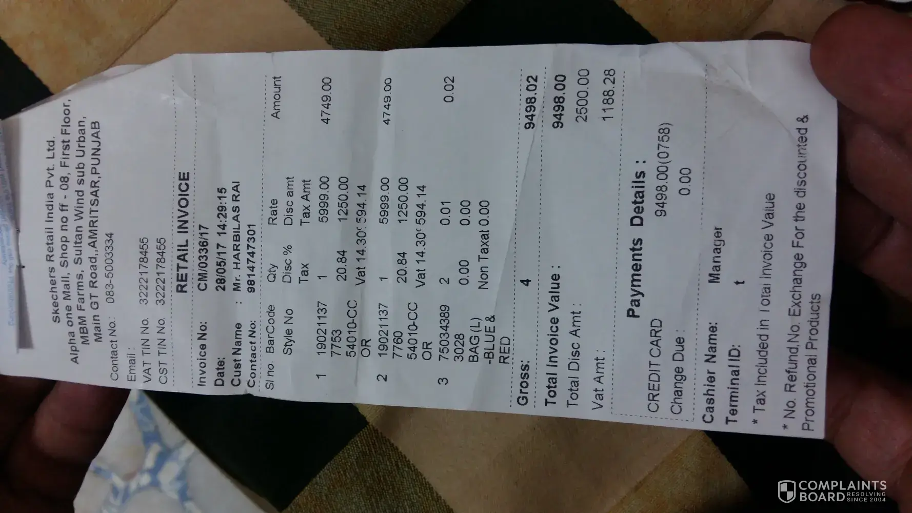We purchased Shoes from very renowned brand Skecher shoes on Feb 26, 2017, costing Rs 5999 from " Skechers Retail Pvt Ltd" C-4 Trillium, Circular Road, basant Avenue, Amritsar, Punjab.