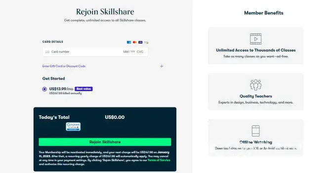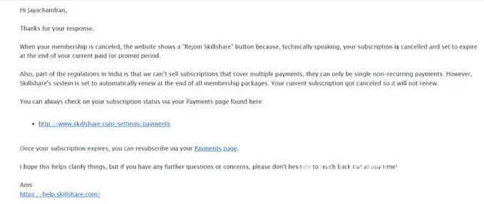 Hi, Based on a friends recommendation i subscribed for Skillshare on 11-Jan-2022 for a 1 year membership, . i paid an amount of 1251 using Paytm as routed by Skill share. But i was surprised to see a "Resume Membership" button within 1 day of subscription asking me to provide my card details for further payment. I really don't understand this. In spite of reaching out to their support team several times, they have not been able to resolve my problem instead they were giving me confusing answers. According to their superstar support team my membership is cancelled because government of India does not support recurring payment for online transactions, which is so silly as i paid the amount for 1 FULL year till 2023, so i have literally gone crazy trying to find a sensible answer. i have messaged them over Twitter, Skillshare support, but i get the same answer repeatedly. Just waiting for them to take mercy on me and payback my money